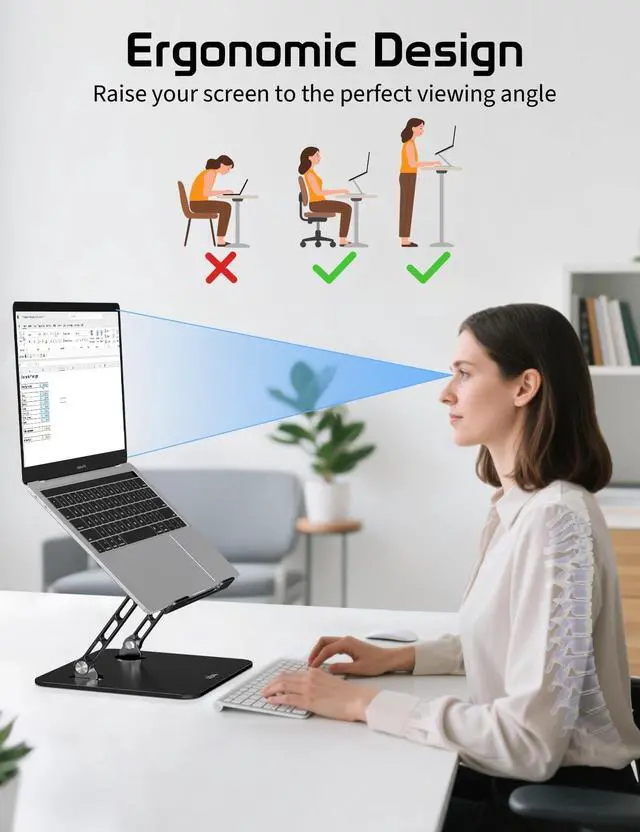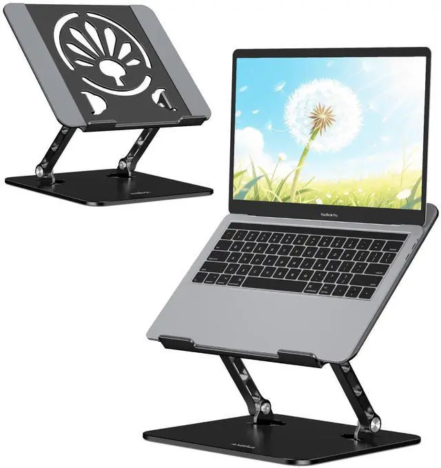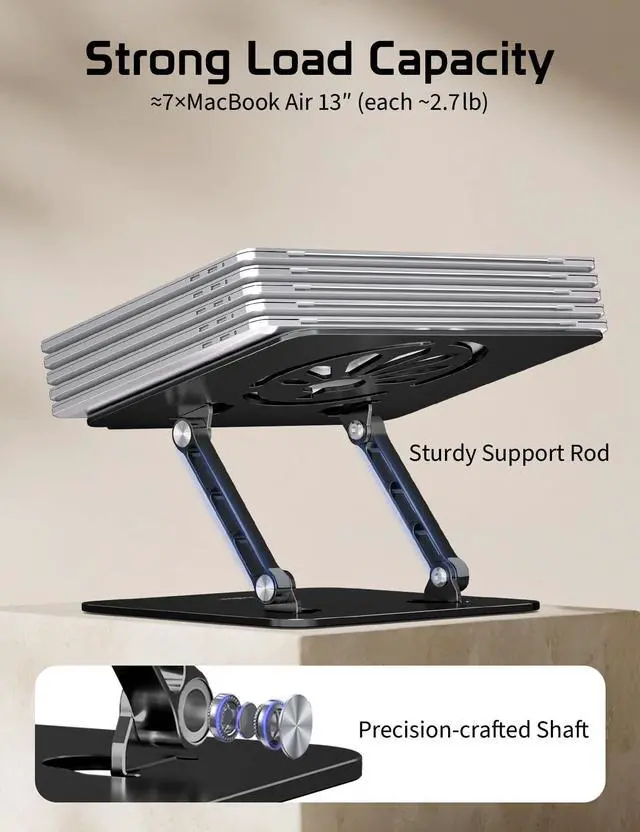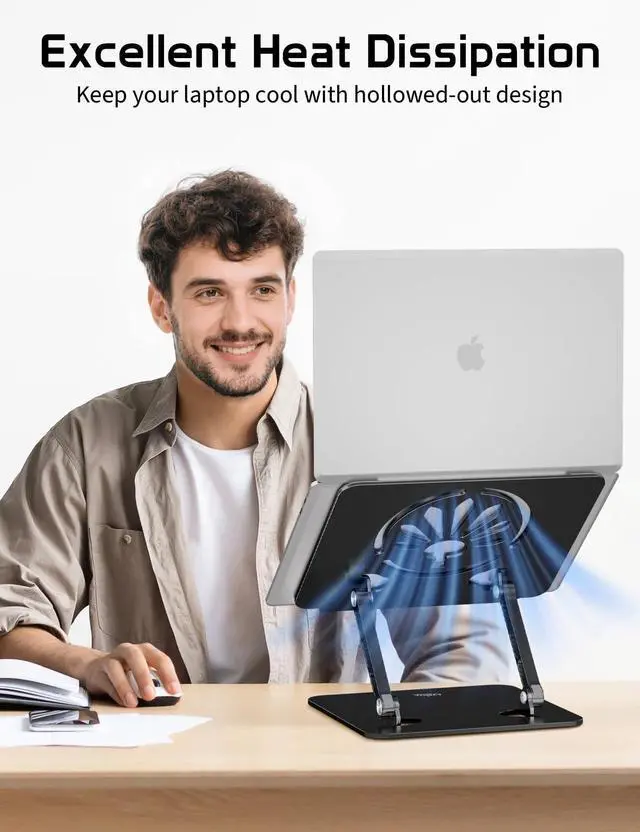 Aluminum Laptop Stand for Desk Crafted from premium aluminum alloy, this laptop riser provides strong, stable support with a sleek design that blends seamlessly into modern offices and home setups ^^ Adjustable Ergonomic Riser Easily change height and angle to improve posture, reduce neck, back, and shoulder strain, and create a healthier, more comfortable working experience ^^ Foldable & Portable Laptop Holder Lightweight design folds flat in seconds for easy storage and travel, making it ideal for office, home, school, coffee shops, or business trips ^^ Cooling & Ventilation Design Open frame structure allows better airflow and heat dissipation, preventing your laptop from overheating and maintaining top performance during long hours of use ^^ Wide Device Compatibility This Laptop stand fits laptops and tablets from 10" to 15.6", including MacBook, Dell, HP, Lenovo, ASUS, Acer, Microsoft Surface, and moreperfect for work, study, and travel