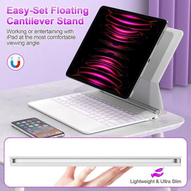 NOTE: Not compatible with any other devices. ^^ Easy-Set Floating Cantilever Stand-Adopt magnetic suspension design, strong magnetic suction to ensure the safety of your iPad, attached your Apple Pencil on top. Gives you the perfect angle just by opening the case, transform your iPad Pro 12.9 Inch 6th/5th/4th/3rd Gen into a laptop within a second. You can also wake up or sleep your iPad by opening or closing your keyboard case-perfect for traveling, business, school. ^^ Precise Large, Click-Anywhere Trackpad-Compared with other products, GOOJODOQ A1901 Pro- 12.9 keyboard case is upgraded to Click-Anywhere touch pad, the whole area can be clicked and pressed. Navigates your iPad Pro 12.9 Inch 6th/5th/4th/3rd Gen in a whole new way with a Click-anywhere touchpad, scroll, swipe, click & press and more. The responsive and reliable trackpad that allows you to use the entire surface to work. ^^ Convenient LCD digital display screen-GOOJODOQ A1901 Pro- 12.9 keyboard case adopts LCD digital display design. The display status includes power status, Caps Lock status, charging status, and Bluetooth connection status. Make you in the process of use more convenient to know whether it has been turned on, whether to open the capital letter function, Bluetooth connection is successful or not, how much remaining power.