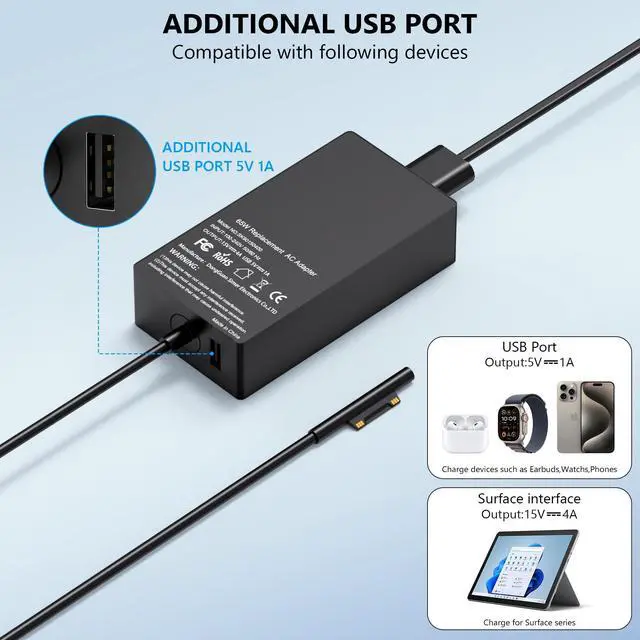USB Port: 5V-1A 65W Surface Charger also supports output power of 65W, 44W, 36W, 24W ^^ 65W