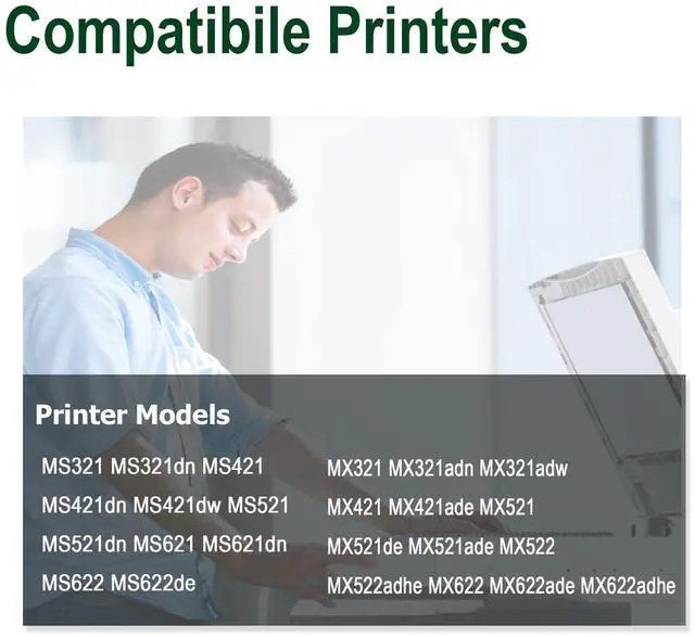 • Compatible Printer:MS321dn, MS421dn, MS421dw, MS521dn, MS621dn, MS622de, MX321adn, MX321adw, MX421ade, MX521de, MX521ade, MX522adhe, MX622ade, MX622adhe laser printer