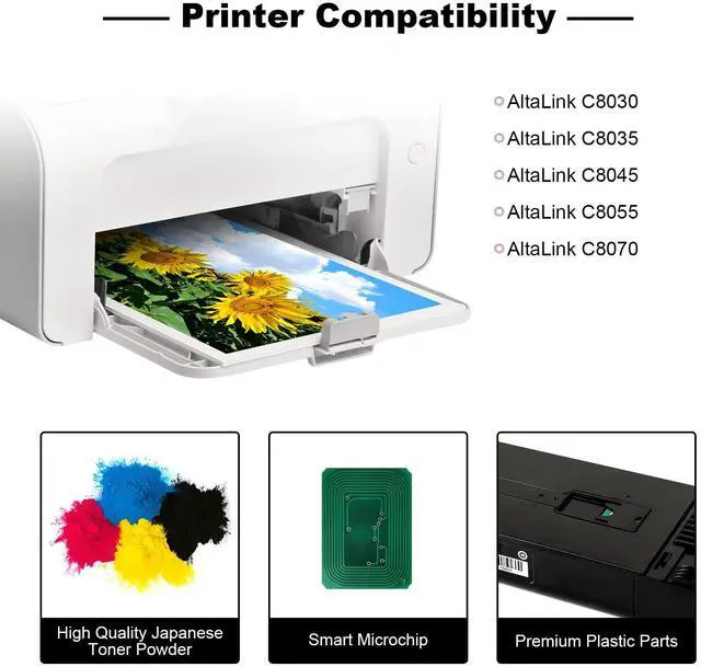 Compatible Toner Cartridge Replacement forAltaLink C8030AltaLink C8035AltaLink C8045AltaLink C8055AltaLink C8070Part NumberYellow 006R01700 x 1PackPage Yield (at 5% coverage A4)Standard Capacity 15, 000