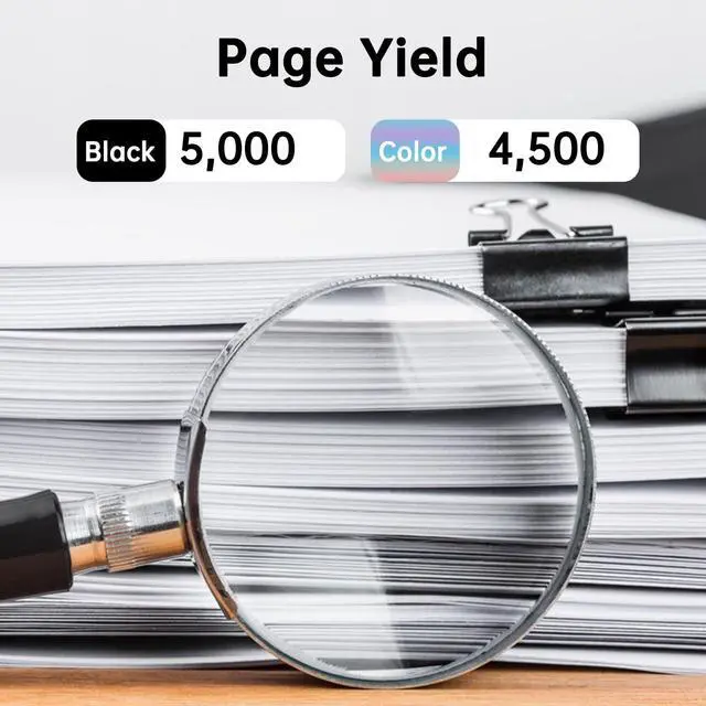 Yield: 5, 000 Pages per Black, 4, 500 Pages per Color cartridge at 5% coverage on letter/a4Why choose our product? Vivid colors and sharp text Good fluidity Professional quality, and long-lasting pages