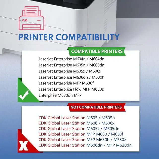 This cartridge works with: Laser Enterprise M604n M604dn M605n M605dn M605x M606dn M606x M630h MFP M630dn M630f M630z Printer ^^ Cartridge yield (approx. ): 11, 500 pages per black ^^ Count on reliable, high-quality printing and save time by avoiding common printing issues; And use our Toner Cartridges to avoid toner leaks, premature failures or dangerous code as much as possible ^^ Buy sustainable Recycled content is included in our toner cartridges; Our Toner Cartridge is voluntarily designed and tests its printing systems to meet Eco-label emissions guidelines ^^ Important NoteThis Toner Cartridge is Not Suitable for CDK Global Laser Station Series Printers