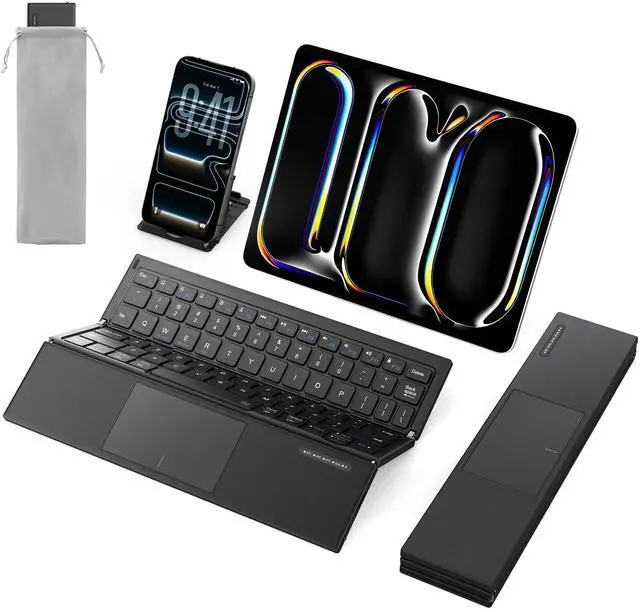 Tri-Fold Bluetooth KeyboardThe 2026 upgraded folding keyboard features a smooth, accordion-style tri-fold design, allowing it to unfold or fold away in just ONE second. The built-in touchpad follows the same layout as a standard laptop, matching your muscle memory. This foldable keyboard with trackpad delivers full-size functionality in an exceptionally thin and lightweight design, without added bulk. ^^ Full Size LayoutDont settle for cramped mini keyboards. This foldable keyboard offers a full-size 5-row layout with a dedicated number row, delivering a familiar and comfortable typing experience. The 0.63 -inch keys better match finger size for accurate, efficient input, helping you stay productive anywhere.