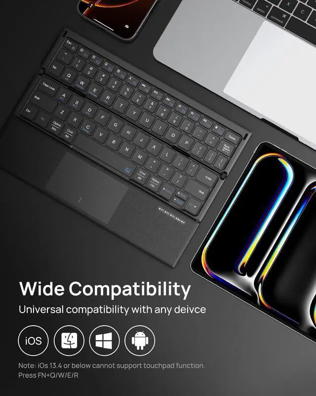^^ Stable DesignThis folding Bluetooth keyboard features responsive scissor-switch keys that ensure every keystroke feels smooth and precise. The reinforced hinge is rigorously tested to withstand over 5, 000 folds, providing a sturdy and stable base, even when typing on your lap. ^^ Wide CompatibilityThis portable Bluetooth keyboard is fully compatible with iOS, Android, Windows, and Mac systems. To ensure optimized touchpad and key functionality for each system, use the dedicated system switching keys: Fn + Q for iOS, Fn + W for Android, Fn + E for Windows, and Fn + R for Mac. This gives you complete control on every device. ^^ Type-C RechargeableProvides up to 150 hours of working time and up to 180 days of standby on a full charge. This foldable keyboard with touchpad automatically enters sleep mode after 30 minutes of inactivity to conserve power, and wakes instantly with a single key press. Stay focused on your work without worrying about recharging.