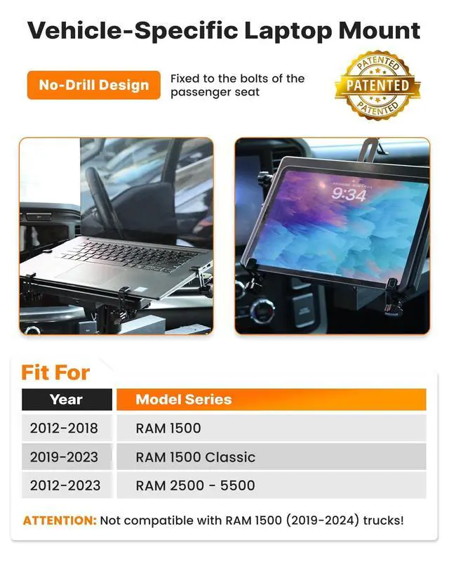 No-drill Vehicle-Specific: Compatible with 2012-2023 Ram 2500-5500, 2012-2018 Ram 1500, 2019-2023 Ram 1500 Classic. Installs using existing passenger seat boltsno drilling, no permanent modification. Patented design ^^ Three-Point Support Base for