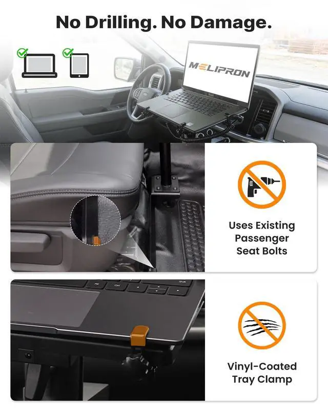Maximum Stability: Heavy duty steel base anchors directly to the seat rail bolts, distributing load to prevent wobble. Vehicle laptop mount is ideal for typing, dispatching, and diagnosticseven on uneven roads or long shifts ^^ Fully Adjustable for