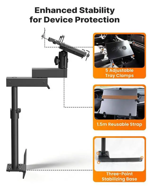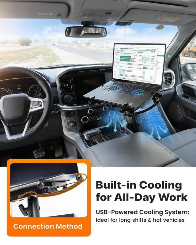 Integrated Cooling & Device Protection: The truck laptop holder includes dual USB-powered cooling fans to reduce laptop heat during long sessions. Five vinyl-coated tray clamps secure devices without scratchingfits laptops up to 17laptops & most tablets