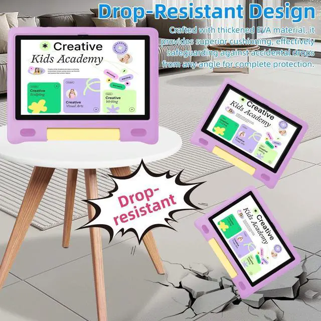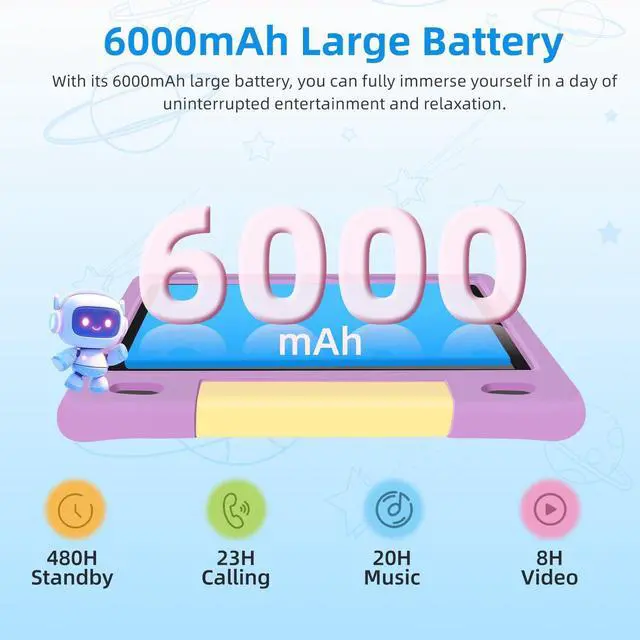LONG-LASTING BATTERY & CHILD-SAFE DESIGN: Featuring a high-capacity 6000mAh battery, this kids tablet provides up to 12 hours of continuous use on a single charge, making it ideal for long road trips, flights, or all-day learning. Encased in a sturdy, shock-resistant EVA protective case, and with a 2-year replacement warranty, its built for durability and worry-free handling, making it safe for active children aged 3-12. ^^ EYE-COMFORTING 10.1 -INCH
