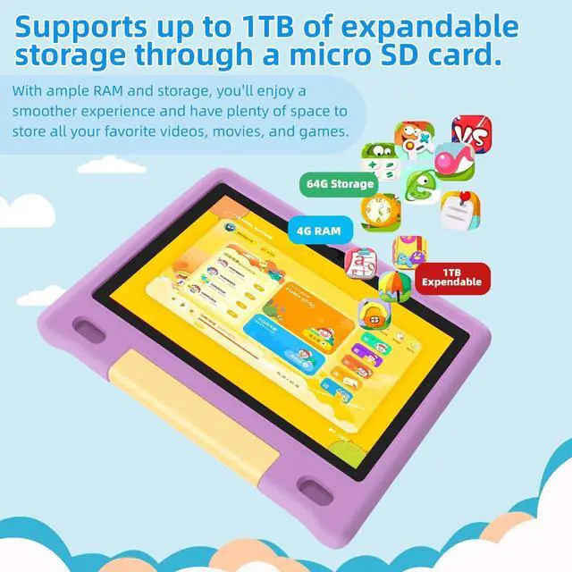 RAM FOR SPEED: Powered by the latest Android 14 OS and an Octa-Core 1.8GH z processor, this kids tablet ensures swift, lag-free performance, perfect for interactive apps, educational games, and streaming. Equipped with 8GB RAM (4+4GB virtual) and WiFi 6 compatibility, it operates up to 40% faster than Android 13 tablets, providing children a smooth and engaging experience with Google Kids Space, YouTube Kids, and other trusted platforms. ^^ 64GB STORAGE with EXPANDABLE 1TB