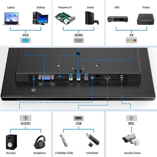 MULTI-INPUT PROFESSIONAL CONNECTIVITY: Supports HDMI, VGA, AV, and BNC inputs, allowing easy connection to security cameras, DVRs, PCs, and legacy devices. Switch between sources without adapters, offering more flexibility than typical small monitors ^^