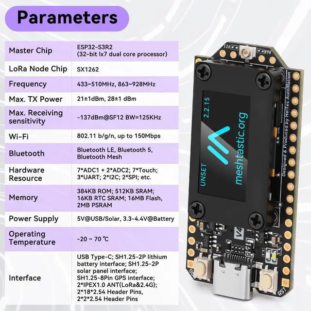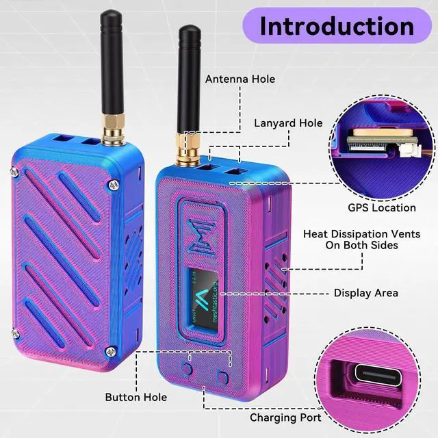 Enhanced Protection: The included N35F purple shell is specifically designed to house your LoRa V4 ESP32 development board, battery, GNSS module, and antennas. With precise cutouts for the display, buttons, charging port, and antenna, along with ventilation holes, this case ensures a snug fit while offering robust protection. Durable and lightweight, its perfect for field deployments or DIY projects.