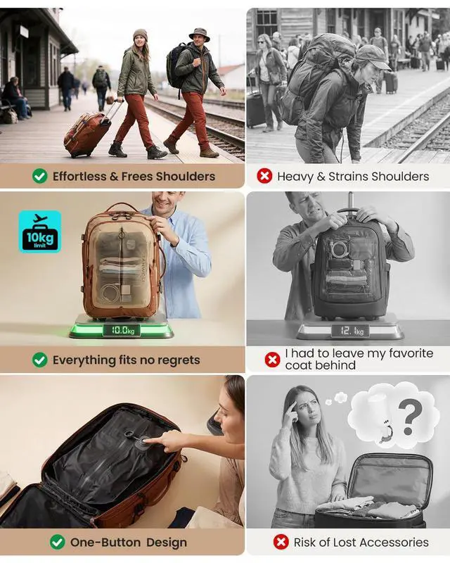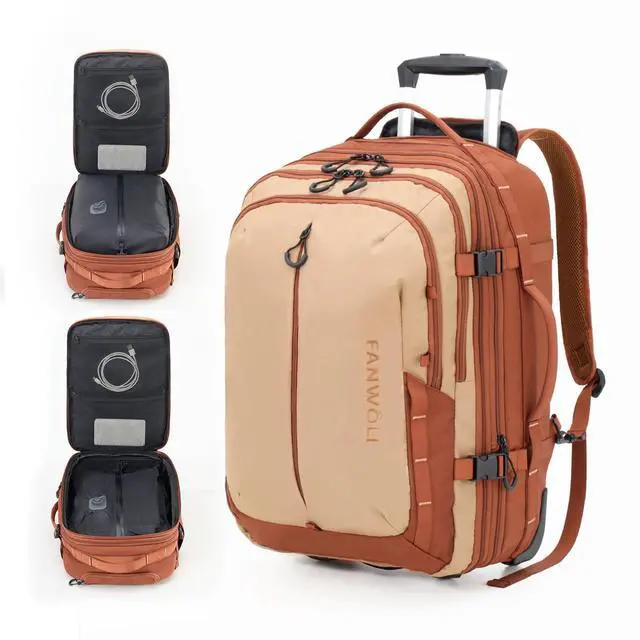 Rolling Backpack: The roller design effectively alleviates the heaviness of the backpack after fully loaded, equipped with anti slip and silent tank wheels, making every step at the airport station easier. For stairs or rough terrain, unfold the hidden thickened shoulder strap to convert it into a compression backpack for travel, the hidden wheel cover can be pulled out to keep clothes from getting dirty by wheel grime. Effortlessly switch to fully enjoy full scene travel ^^