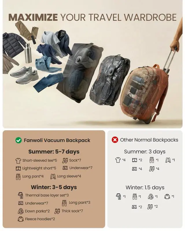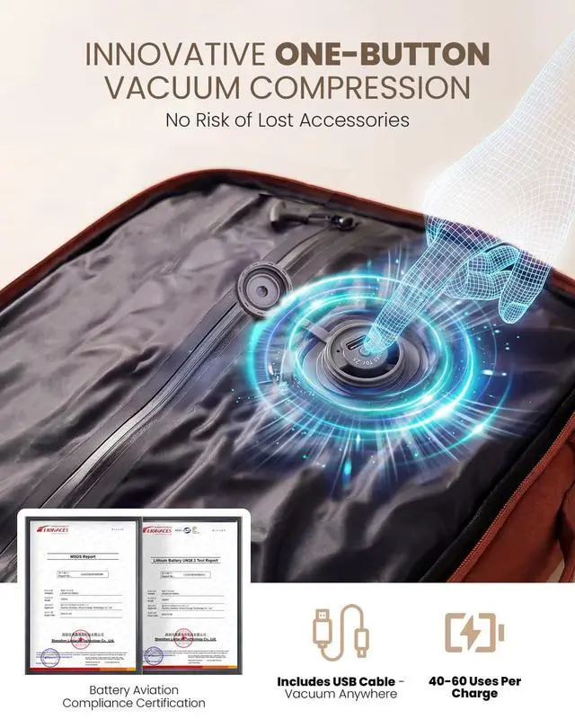 One-Button Vacuum Compression System: Say goodbye to manual pumps and easily lost accessories. Featuring a built-in electric pump, our vacuum backpack travel with pump compresses clothes by 30%-50% with a simple long-press, easily accommodating 5-7 days of clothing. Includes a USB cable for charging, ensuring that you can use this travel backpack with vacuum system to compress clothes at any time in campsites, dormitories, airports, never be left helpless with a bloated bag you can't re-compress ^^ Versatile 2-In-1