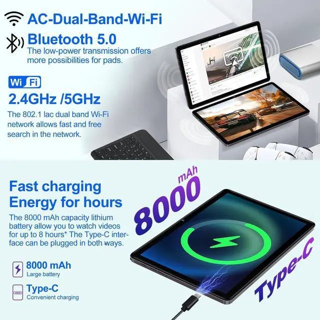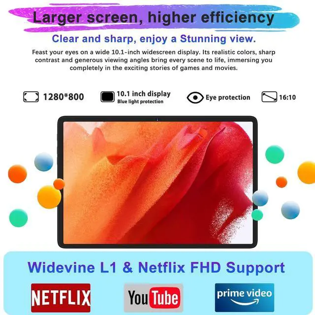 ^^ Slim Metal Body + Widevine L1/Netflix FHDDesigned with a premium slim metal body, just 7mm thin and weighing only 448g, this tablet android is highly portable. The 10.1 -inch incell TDDI Full View display with a 1280x800 resolution provides sharp visuals, rich colors, and a lifelike viewing experience. With Widevine L1 certification, it supports 1080P Full HD streaming on Netflix, Prime Video, Disney+, and YouTube, so you can enjoy your favorite shows in high definition. ^^ More Features & Customer SupportEquipped with GPS for accurate navigation and split-screen functionality for better multitasking, this 2-in-1 tablet also features face unlock for added security and easy access.