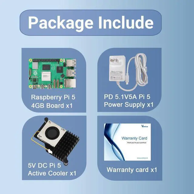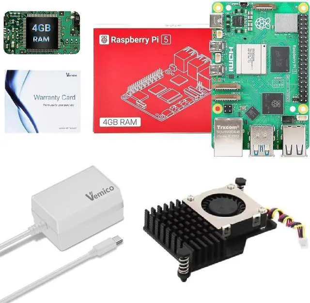 Input: AC100-240V; It allows the the Pi 5 to power a wider range of peripherals. ^^ Basic Cooling for Raspberry Pi 5The Kit with Active cooler for Raspberry Pi 5, as same as Official Raspberry Pi 5 Active Cooler. The Pi 5 Active Cooler is composed of Temperature-controlled Blower Fan and Aluminium Heatsink and comes with Thermal Tapes to accelerate heat dissipation, providing Pi 5 4GB board better cooling effect. ^^ Wild ApplicationVemico Raspberry Pi basic kit wildly applicable to building intelligent house application, robots, video Surveillance, remote-control car models, automatic machine etc, 3D Printer, PC for Programming etc DIY Projects.