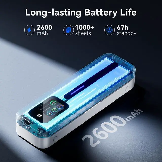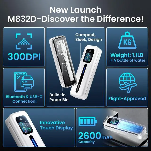 Portable & Lightweight Design: Phomemo M832D compact printer weighs just 1.5 lb, with a compact size that fits easily into your backpack, briefcase, or car. Optimized motor algorithms and refining the print head design reduce printing noise by 30%. The built-in 2600mAh battery allows for up to 200 pages of continuous printing on a single charge, making it ideal for on-the-go printing ^^ Wide Compatibility &