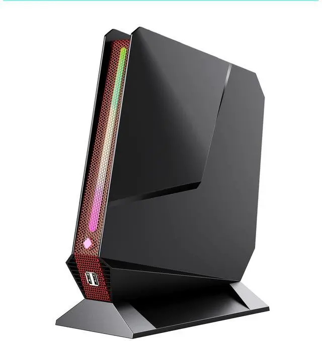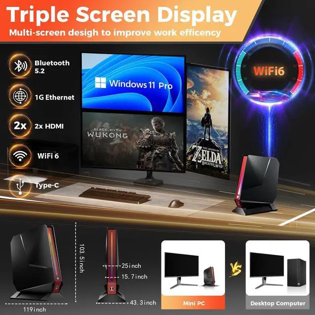 ^^ This black mini gaming PC have 4K@60Hz Triple display (Dual HDMI + Type-C), to multitask at the same time, Built-in Wifi 6 802.11 ax @ 2.4 +5G dual wifi and BT 5.2, WiFi 2.4G +5G Dual Band networking ensure stable, can easily connect to wireless devices like mouse, keyboard, printer, monitor, TV, projector. etc. ^^ With high cooling efficiency provided by twin turbo smart fans and a copper module heat spreader, this micro computer operates at a quiet level under 38 dB. RGB rainbow lighting design with seven color gradient when it's on.