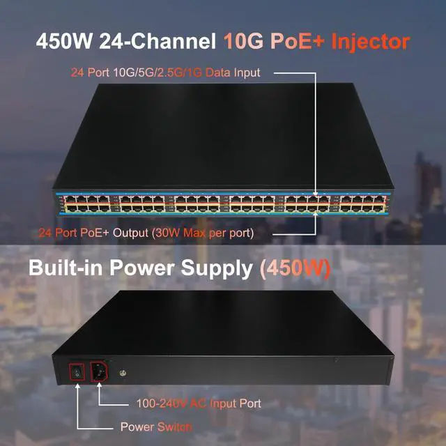 PoE Power: Built-in 450W Power Supply ,each port output power of 30w Max for PoE+ devices like security camera, APs.