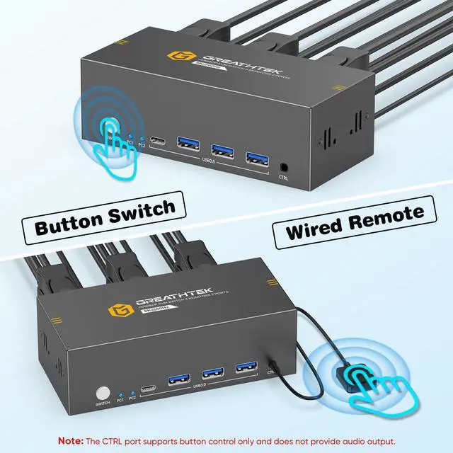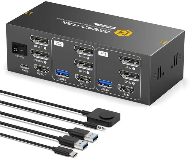 Note: The device does not support hotkey switching. ^^ Adaptive EDID & Plug And PlayWith EDID adaptive technology, the KVM switch automatically identifies and synchronizes each computers display settings, maintaining stable and clear image transmission without screen flicker or distortion. Installation is effortlesssimply plug in all cables and power on. No drivers or configuration are needed. Start enjoying smooth dual-monitor control across two computers in seconds. ^^ Good after-sales service The package includes 1*HDMI+DP KVM switch host, 2*USB 3.0 cables, 1*wired desktop keypad, 1*USB C power cable, and 1*user manual. You will receive lifelong support from GREATHTEK. If you encounter any problems during use, please contact us for assistance.