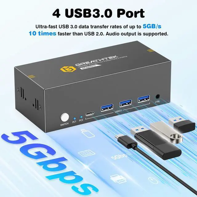 Note: Please use high-quality HDMI 2.1 and DP 1.4 cables to achieve 8K@60Hz performance. ^^ 4 USB 3.0 PortsThe 8K@60Hz HDMI KVM switch is equipped with four USB 3.0 ports, with a transfer speed of up to 5Gbps, which is 10x faster than USB 2.0. It enables 2 computers to share USB devices, such as a mouse, keyboard, USB flash drive, camera, etc. ^^ 2 Switching MethodsThis KVM switch supports button switching and desktop wired keypad remote switching.