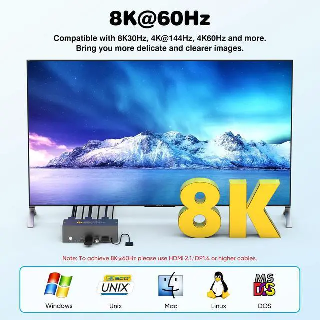 HDMI+Displayport KVM Switch 3 Monitors 2 ComputersThis 3 monitors KVM switch allows you to control 2 computers using a single set of keyboard and mouse while sharing three monitors one via HDMI and two via DisplayPort. It greatly improves your productivity by eliminating the constant plugging and unplugging between systems. Switching between computers is fast and stable with just one click. It supports major operating systems including Windows, macOS, and Linux, and offers true plug-and-play functionalityno additional drivers or complex configuration required, plug and play. ^^ 8K Ultra-HD Visual QualityOur dual-monitor KVM switch delivers stunning 8K@60Hz/4K@144Hz visuals with crystal-clear details on your monitors, The KVM works seamlessly with HDMI 2.1 and DP 1.4, allowing playback of protected content without interruption.