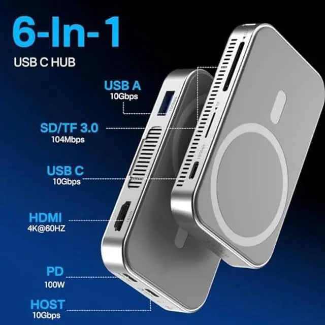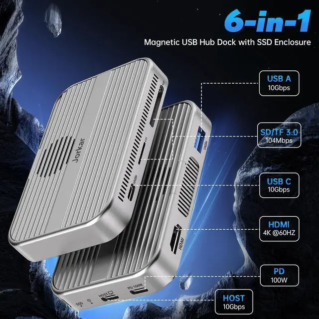 USB C Docking Station: Jorkar 6 in 1 USB C dock is a multi-function docking station. It features 4K@60Hz HDMI port, SD 3.0 card reader, TF 3.0 card reader, 10Gbps USB C, 10Gbps USB A port and PD100W port. It is great for laptop/tablet/phone docking station to improve your office efficiency.