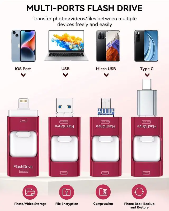 ^^ Universal 4-in-1 Compatibility: Featuring Lightning, Type-C (with separate adapters), micro USB and USB interfaces, this iphone photo storage stick connects seamlessly with iOS devices, Android OTG phones, laptops, and tablets. No iCloud fees, no internet requiredjust plug in and move files freely between your phone, computer, and other devices. ^^ Premium Build & Smart File Management: Smart flash drive made from high-quality aluminum alloy, this iPhone external storage ensures reliable performance. The dedicated app lets you view, copy, move, and delete files directly. With one-click sharing, you can easily transfer files, making it an ideal solution for freeing up iPhone storage space. ^^ Secure Your Memories with