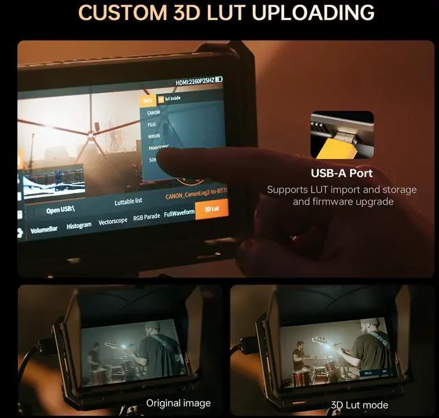 Monitoring: By importing 3D LUT through a USB-A interface, and the VILTROX DC-X2 camera monitor has many professional monitoring functions, such as Parade waveform, Oscillogram(RGB/YUV/Y), vector graph, brightness histogram, auxiliary focus, audio column, image flip, false color, etc. ^^ 4K HDMI / 3G-SDI