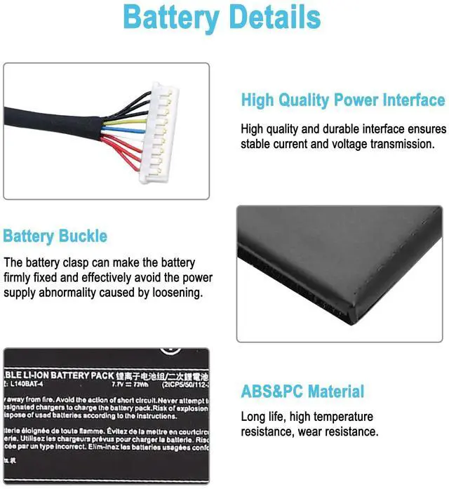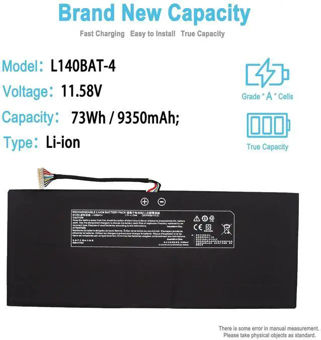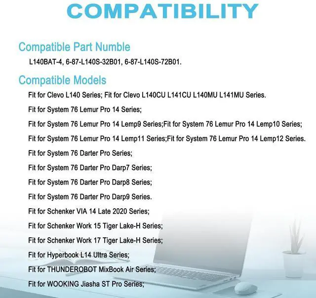 Condition: 100% brand new from manufacturer. ^^ Replacement Battery Part NumbersL140BAT-4, 6-87-L140S-32B01, 6-87-L140S-72B01. ^^ Compatible ModelFit for Clevo L140MU L141MU L140CU L141CU Series; Fit for Schenker VIA 14 Late 2020 Series; Fit for Schenker Work 17 Tiger Lake-H Series; Fit for System76 Lemur Pro 14 2020 2021 2022 (lemp9) (lemp10) (lemp11) Series; Fit for Wooking Jiasha ST Pro Series; Fit for Hyperbook L14 Ultra Series. ^^ After-sales supportWe support 30 days refund, 12 months warranty (refund or replace battery), 247 mail support. If you have any questions, please contact us by email. ^^ Security/QualityAll batteries are UL, CE, FCC, RoHS safety certification, built-in over charge, over discharge, over temperature, short circuit protection. The battery offers up to 1000 charge cycles and uses grade A battery cells to improve charging speed and battery performance, ensuring performance and durability. ^^ After-Sales SupportWe support 30 days refund, 12 months warranty (refund or replace battery), 24 x 7 mail support. return window will close one month after you receive the product and you can contact us by placing your order or by clicking " Ask a question" on the seller's page.