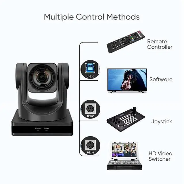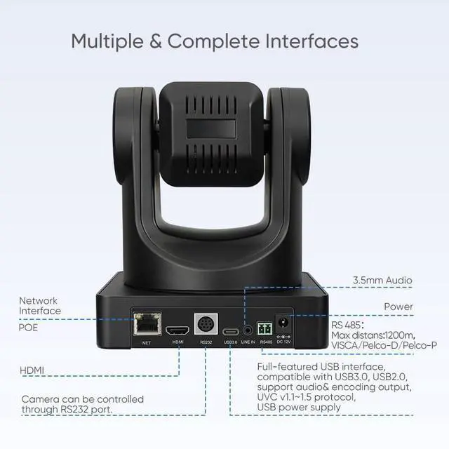 Protocol: VISCA/Pelco-D/Pelco-P Power Jack JEITA typeDC IN 12V/USB B typeDC IN 5V/PoEGeneric Specification Input Voltage DC 12V/DC 5V/PoE( 802.3 af) Power Consumption 12Wmax Size 144mm x 144mm x 167.9 mm