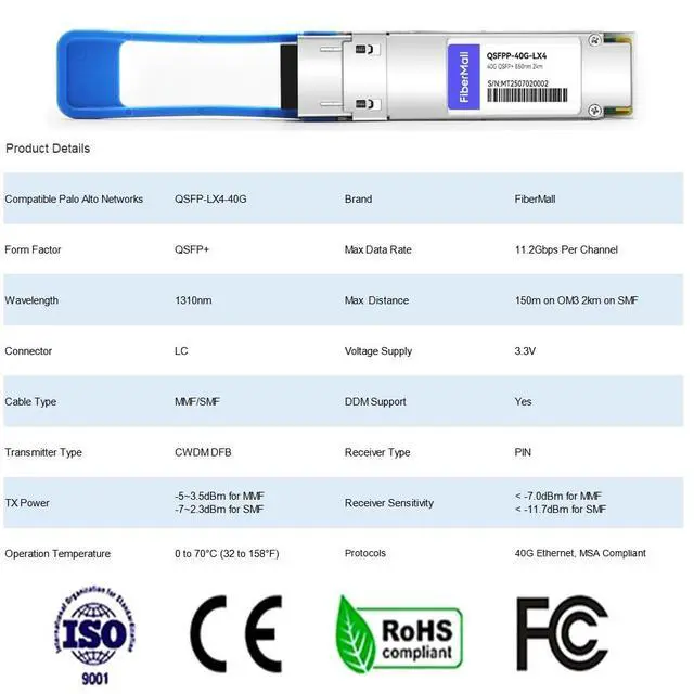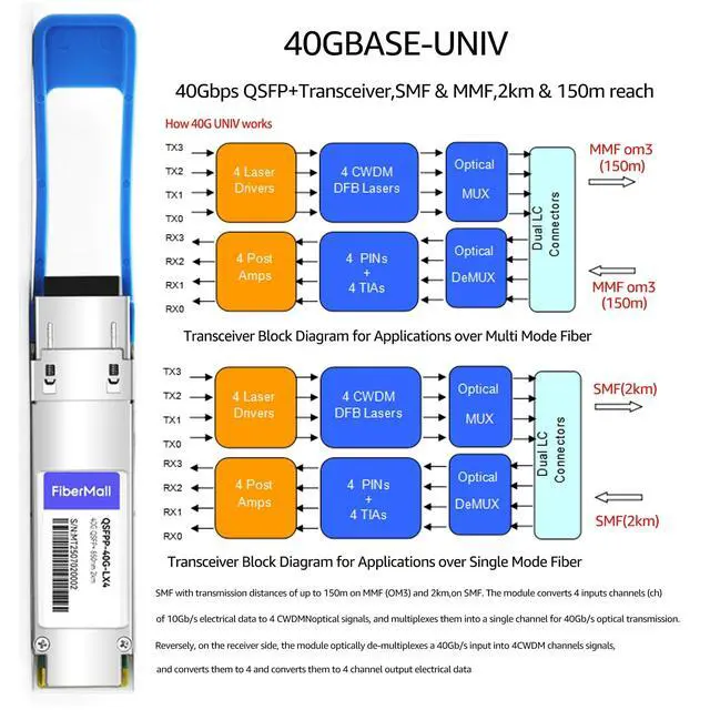 40G QSFP+ UNIV Transceiver Module, 40GBASE-LX4, single mode and multimode, 1310nm, 4CWDM, OM3/150m /MMF, SMF/2km, LC duplex connector, Hot Pluggable, support DOM ^^ 40GBASE-LX4 Built-in high performance Chip, Max. Power Consumption 3.5W enable Prolonged Service Life, Commercial Temperature Range 0 to 70C (32 to 158F) ^^ Built-in Real Time Digital Optical Monitoring Capability for Strong Diagnostic Capabilities ^^ Protocols Compliant with QDR/DDR Infiniband data ratesUp to 150m transmission on OM3 multimode fiber (MMF) or 2km transmission on single mode fiber (SMF). ^^ Hot Pluggable QSFP+ Form Factor, Compliant to SFF-8436, QSFP MSA and ROHS.