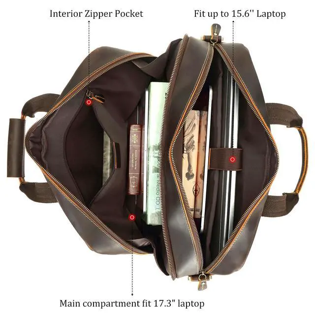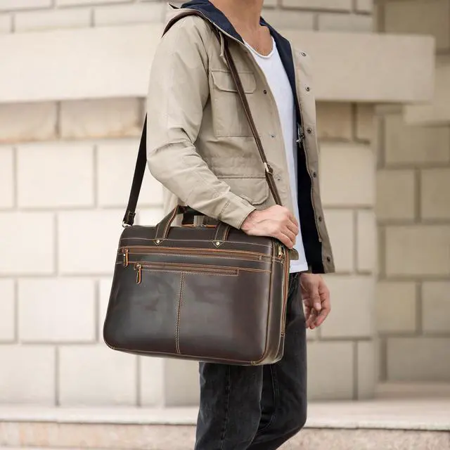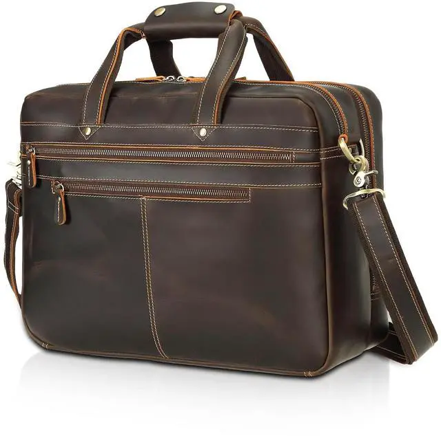 DescriptionThis classic style laptop bag, made from genuine leather, is intended for both personal and professional use. It's rugged natural finish stands out among cheaper leather bags that hide these characteristics. Expertly crafted using heavy duty synthetic thread and designed to last.