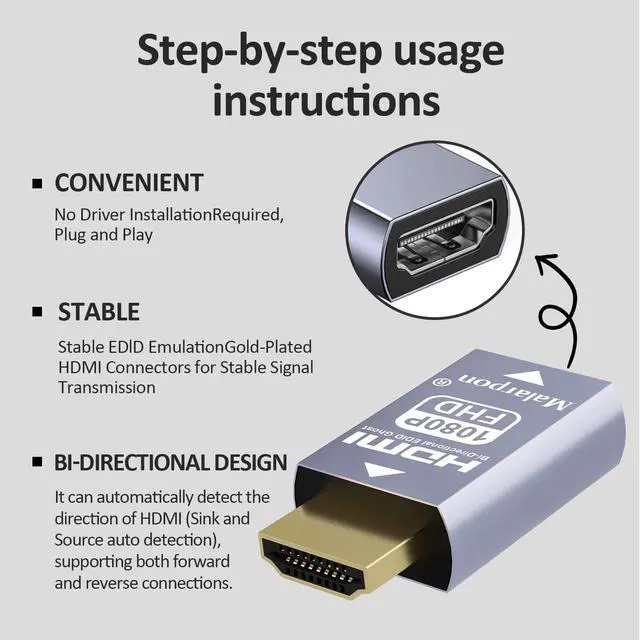 accelerates the negotiation when the display is frequently off ^^ Avoid distorted image - When no software work around, plugged this adapter between the HDMI switch and work laptop and it changes the EDID, get the option back in Windows. No more distorted image! Contact 24 hours get with help and Not satisfied with the 34-day service