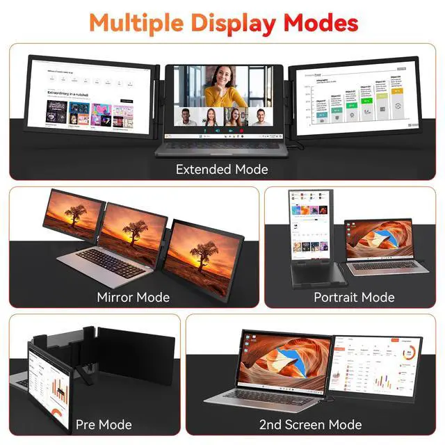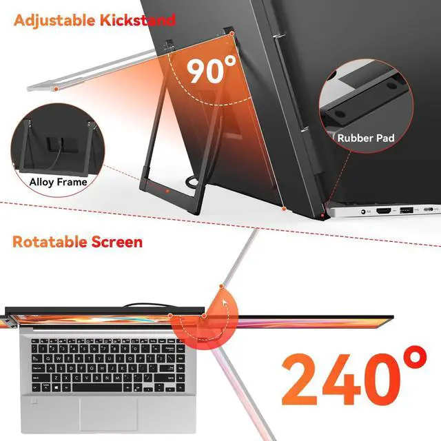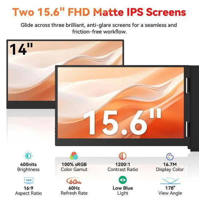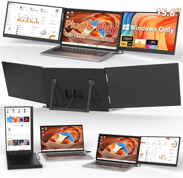Note: Your Windows laptops USB Type-C port must support Thunderbolt 3/4 or USB 3.1 DP Alt Mode ^^ Durable & Adjustable Aluminum Design - Built with a sleek aluminum alloy frame, this dual portable monitor offers both stability and style. Unlike clip-on screen extenders, it sits securely behind your laptop without attaching to the displayeliminating screen damage and height restrictions. The 240 rotation, 90 kickstand, and non-slip rubber base give you full control over your viewing angle in any setup. ^^ Vibrant Dual 15.6" FHD IPS Displays - Enjoy sharp, true-to-life visuals with 100% sRGB color, 400 nits brightness, and a 1200:1 contrast ratio. Each screen features its own OSD menu for custom adjustments to RGB, sharpness, and contrast. Flicker-free and low blue light technology helps reduce eye strain during long sessions, while an optional low-power mode saves energy. ^^ Everything You Need in the Box - Get started right away with the complete kit: 1 x triple portable monitor, 2 x USB-C to USB-C cables, and a power adapter. Backed by a 1-year warranty and 24/7 expert supportif you have any questions about compatibility, setup, or missing parts, our team is ready to help. Contact details are included in the user manual.