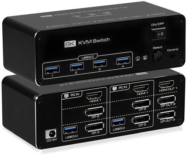 8K@60Hz HDMI KVM Switch 3 Monitors 2 Computer, 4K@120Hz KVM Switch Displayport with 4 USB 3.0 Ports for Sharing Keyboard Mouse Hard Drives Printer, Compatible with Windows/Linux/Unix/Mac Plug & Play