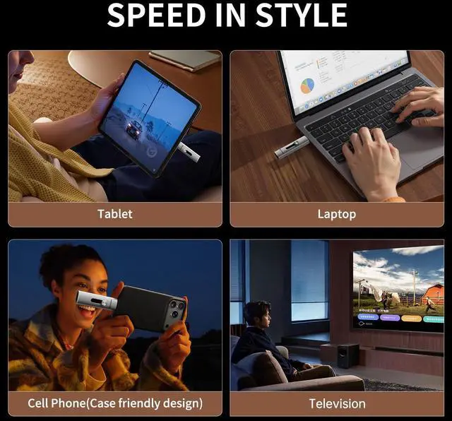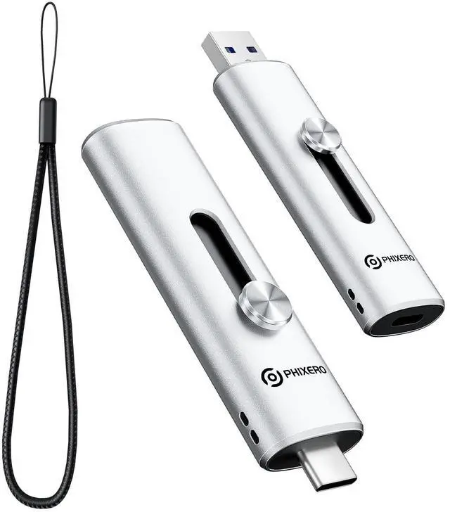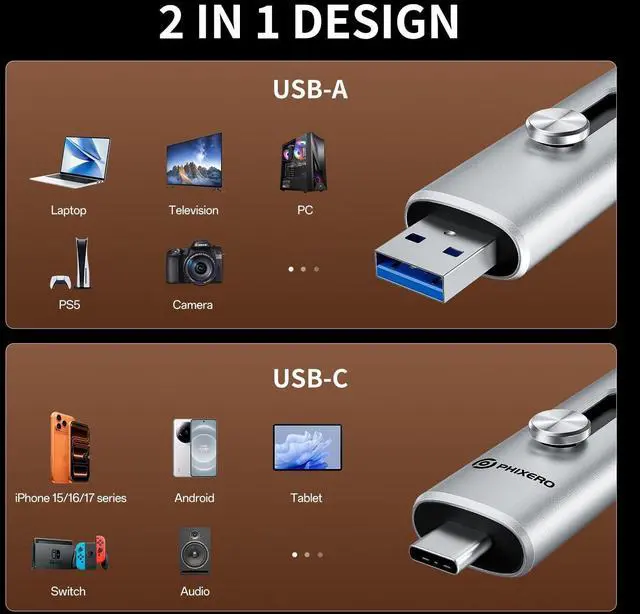 Dual Ports & Wide CompatibilityPHIXERO P201 external SSD 1TB Equipped with USB-A and USB-C ports, compatible with iPhone 17/16/15 series, USB-C Android phones, MacBook, PC, laptops, smart TVs, car audio systems and PS5. No adapter required, easily transfer files, back up data, store photos or enjoy gaming. ^^ Ultra Fast TransferPHIXERO Protable SSD USB 3.2 Gen2 high-speed protocol with read/write speeds of up to 1, 100MB/s. Move 4K videos, large project files or game libraries in seconds. Plug and play, no additional drivers required.