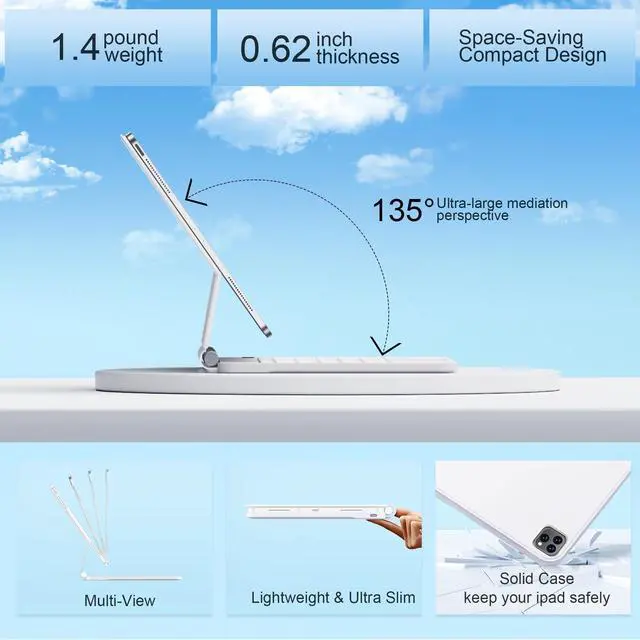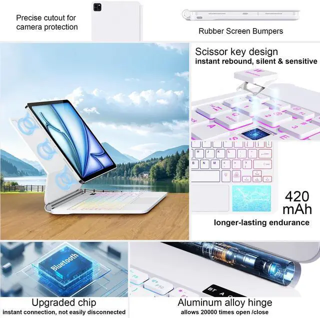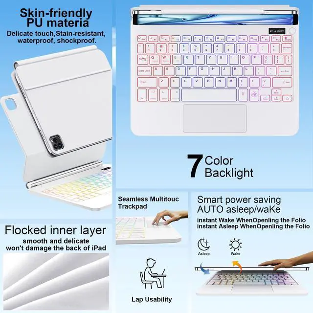 Air 13/Pro 12.9: One of the standout features of this case is integrated multi-touch trackpad. With a variety of trackpad gestures, you can turn your iPad into a highly efficient laptop, making tasks like swiping and scrolling a breeze. Enhance your productivity with keyboard shortcuts, designed to provide swift access to iPadOS features for a seamless and efficient operation. This functionality opens up new ways to interact with your iPad, enhancing productivity and user experience. ^^ Case Keyboard for iPad with