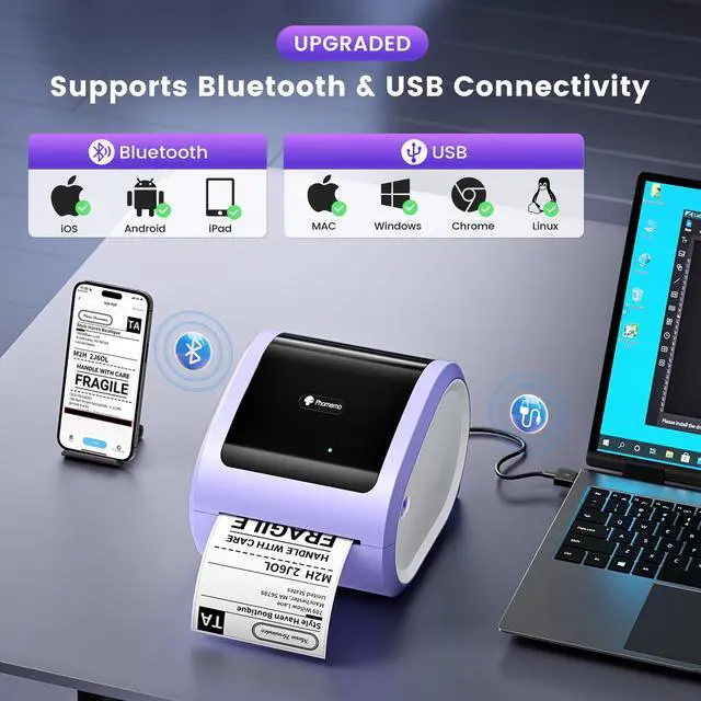 Connectivity Options: The Phomemo D520BT label printer offers both USB and Bluetooth connectivity, providing compatibility with a variety of devices. Easily pair with Android and iOS devices via Bluetooth using the Labelife app. Additionally, it supports USB connections to Windows, Mac, Chrome OS, and Linux systems, meeting diverse user requirements for a desktop thermal label printer ^^