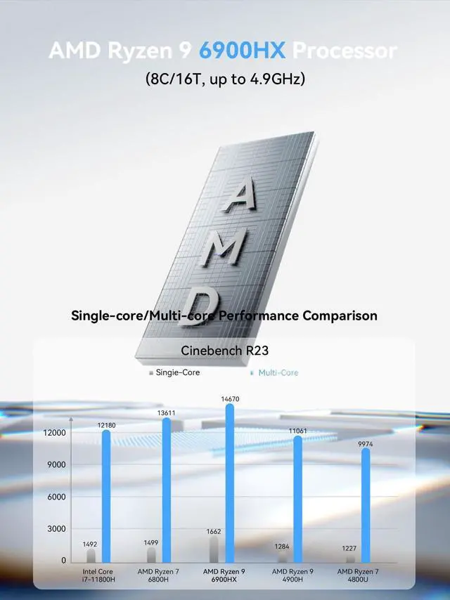 Excellent ProcessorThe MINISFORUM UM690L Slim Mini PC is a small form factor Desktop Tower Computer with an AMD Ryzen 9 6900HX (8C/16T up to 4.9G hz) processor. The process rule has improved from the previous generation of 7nm to 6nm, with Zen 3+ architecture, the computer can handle heavy computing tasks smoothly and better for multitasking. It widely used for light games, image editing, browsing, watching movies, programming etc. ^^ Powerful Graphics The Venus Series UM690L Slim Small PC equipped with AMD Radeon 680M Graphics which built on the latest RDNA 2 architecture, brings ultra-high frame rate experiences and advanced content creation features anywhere and delivers staggering performance beyond your imagination.