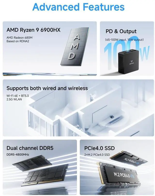 ^^ 8K Video OutputThis Personal Computer has Three video output, 1x USB4(8K@60Hz), 1x HDMI(4K@60Hz) and 1x DisplayPort(4K@60Hz), which support multiple monitors display at the same time and provide a larger and wider filed of view and improve your work efficiency. With the special USB4 port, you could take advantage of high speed data transfer and can enhance the graphics function. An great idea Mini PC for playing videos, utilizing APPs and easily to run PS, AI, CAD etc. ^^ Expandable CapacityUM690L Slim Small PC has pre-installed LPDDR5-6400 32GB RAM (can't be upgraded) + 512GB 2280 NVMe SSD (up to 2TB).