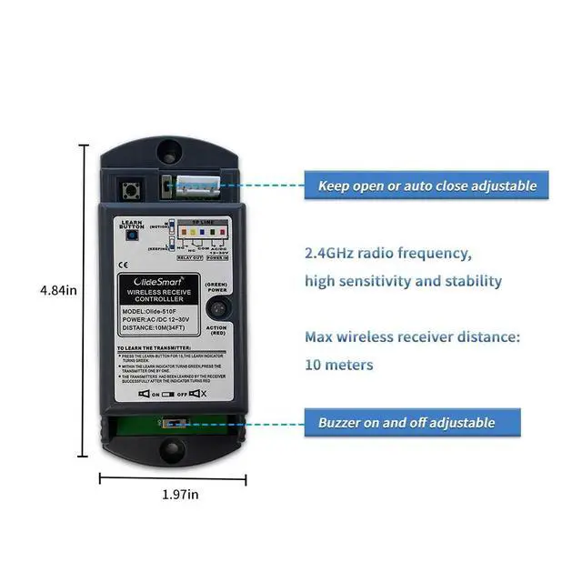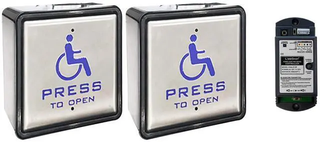 One Olideauto Handicap Wireless Push Switch with 2pcs Push Panels and 1pcs 2.4G Frequency High Stability Receiver unit comes with two pcs handicap push switches and one pcs receiver, please connect the terminal of receivers with other items such as automatic door opener, handicap push switch can be wired or wireless, modes can be easily changed on the panelTechnical