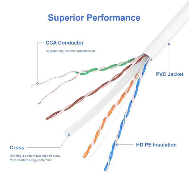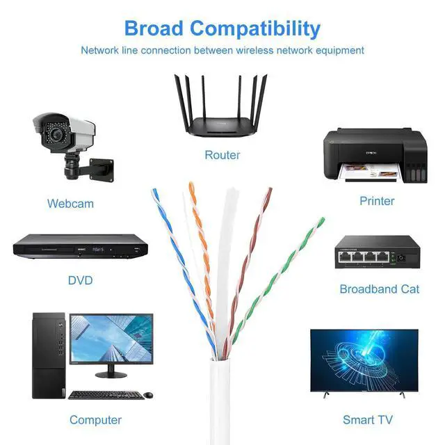 ^^ Clean White PVC Jacket The white outer jacket helps the CAT6 Ethernet Cable 1000FT blend naturally with walls and ceilings for discreet indoor installations. ^^ Reliable Everyday LAN Performance Suitable for internet distribution, smart home devices, security systems, and office equipment using common Gigabit Ethernet connections.