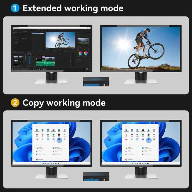 Dual Mode KVM Switches: This dual display KVM Switch also support extended working mode and copy working mode. In Extended mode, each monitor can display different content if the device supports it, while in Duplicate mode, both monitors will display the same content.