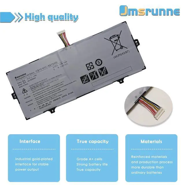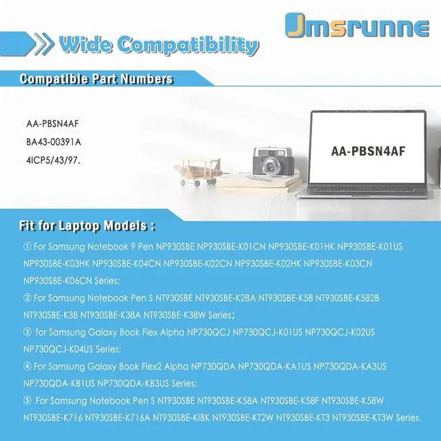 Purchasing Note: Due to the complexity of laptop battery models, you may not be able to accurately determine the model you need to purchase, Please open the back cover of the laptop to confirm the original battery model number ^^ AA-PBSN4AF battery Compatible laptop ModelsFit For Samsung Notebook 9 Pen NP930SBE NP930SBE-K01CN NP930SBE-K01HK NP930SBE-K01US NP930SBE-K03HK NP930SBE-K04CN NP930SBE-K02CN NP930SBE-K02HK NP930SBE-K03CN NP930SBE-K06CN Series; For Samsung Notebook Pen S NT930SBE NT930SBE-K28A NT930SBE-K58 NT930SBE-K582B NT930SBE-K38 NT930SBE-K38A NT930SBE-K38W Seriesfor Samsung Galaxy Book Flex Alpha NP730QCJ NP730QCJ-K01US NP730QCJ-K02US NP730QCJ-K04US Series. ^^ AA-PBSN4AF battery Compatible laptop ModelsFor Samsung Galaxy Book Flex2 Alpha NP730QDA NP730QDA-KA1US NP730QDA-KA3US NP730QDA-KB1US NP730QDA-KB3US Series; For Samsung Notebook Pen S NT930SBE NT930SBE-K58A NT930SBE-K58F NT930SBE-K58W NT930SBE-K716 NT930SBE-K716A NT930SBE-KIBK NT930SBE-KT2W NT930SBE-KT3 NT930SBE-KT3W Series. ^^ Replacement Part NumberAA-PBSN4AF PBSN4AF BA43-00391A 4ICP5/43/97. ^^ TipsIf the new battery is not recognized during the initial installation, please reinstall and check if the interface is fully connected. Discharge the new battery to 5% not 0%, then charge and cycle 3-4 times to wake up the new battery ^^ Security & high qualityEvery battery has passed factory testing, grade A cells ensure fast charges, built-in circuit protection ensures both safety and stability.
