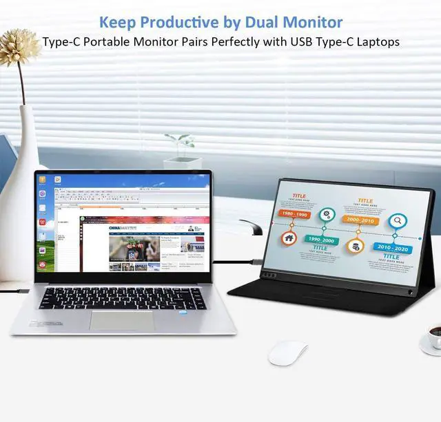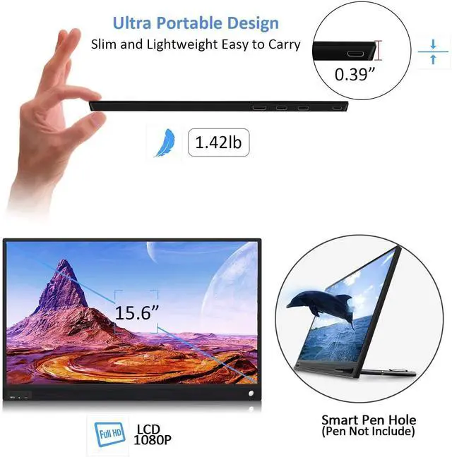 Ultra Portable Monitor: 15.6 IPS monitor offers the full HD resolution of 1920x1080, design with 1.42 pounds (only monitor) and 0.39 inches, slim and light, make it easy to carry, handy, best for travelling ^^ Super Easy to