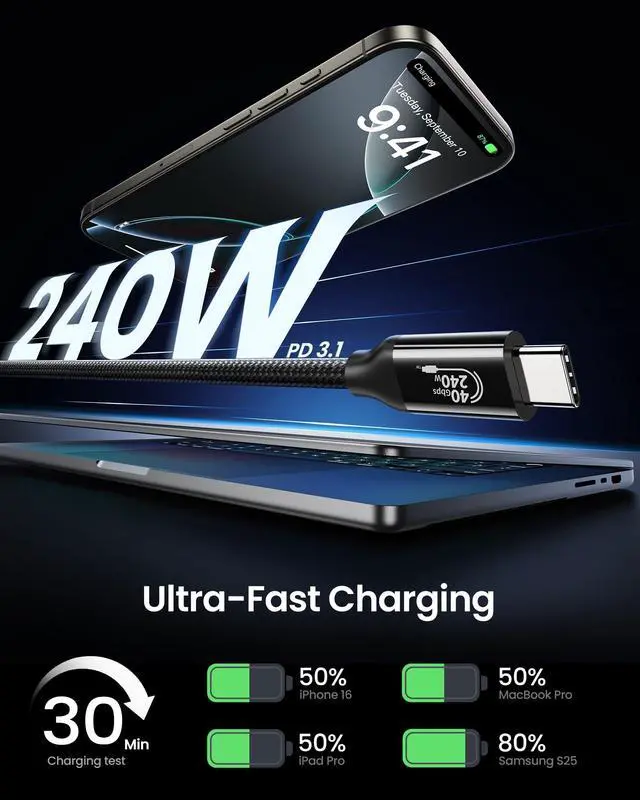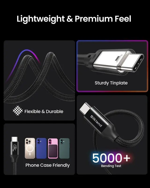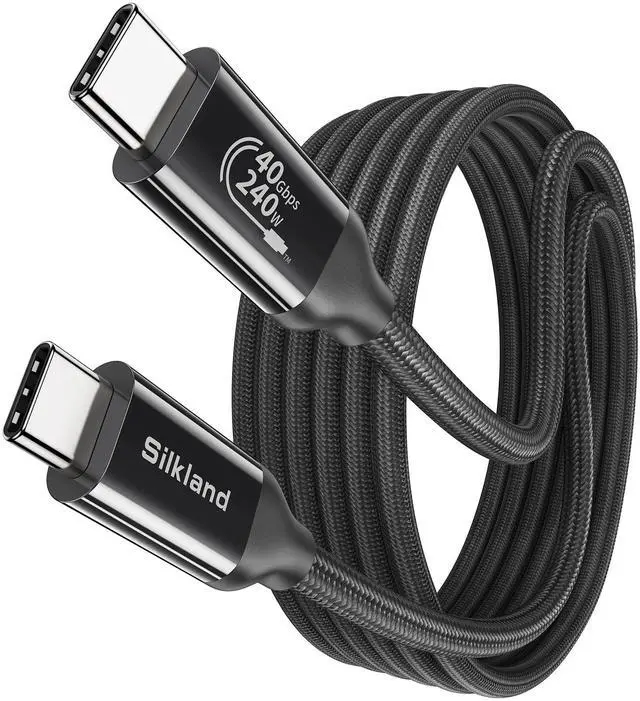 (Note: Requires DP Alt Mode support on devices) ^^ 240W PD 3.1 ChargingUp to 240W (48/5A) power supply. Auto-detects connected devices to deliver precise 180W/140W/100W/60W/35W/18W power. Safely charges a 16" MacBook M4 Max to 50% in 30mins while transferring data at full speed. E-Marker chip prevents overheating even during intensive 8K video editing sessions ^^ Thunderbolt 5 (USB-C) ReadyWorks seamlessly with Thunderbolt 5/4/3, USB4, and USB 3.2 Gen 2x2 devices. It also has full backward compatibility with legacy USB-C devices, covering a wide range of the USBC device ecosystem. This includes PSSD, docks, laptops, Pro Display XDR, MacBook, iMac M4, iPhone 16/15 series, Galaxy S25 Ultra, VR headsets, and eGPU rigs ^^ Military-Grade Endurance Multi-layer braided USB4 cable withstands 5, 000+ 180 bends (Most cables fail at 1, 500 bends). The lightweight ABS housing delivers a sleek, modern look. 86% thicker tinplate shielding ensures interference-free performance. A tangle-free magic strap is included to keep your setup neat and organized ^^ Services from SilklandWe pride ourselves on delivering high-quality cables and exceptional customer service. We stand by you throughout your Thunderbolt cable journey, offering a 24-month warranty and technical support within 18 hours to resolve any issues