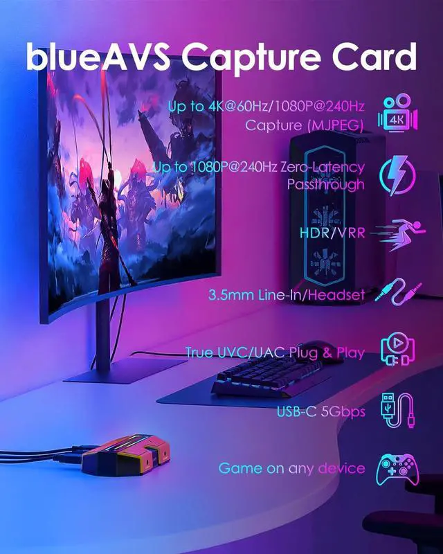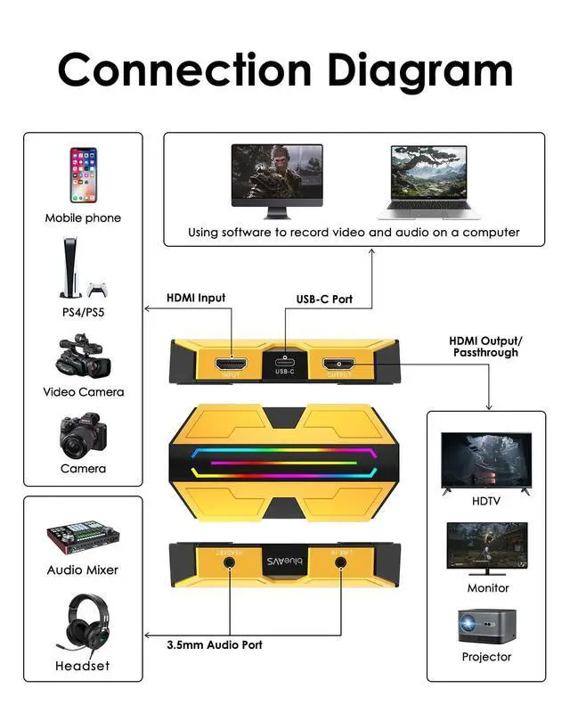 ^^ Flexible Audio Mixing with 3.5 mm PortTake complete control of your stream's audio with the dedicated 3.5 mm audio port. Support both line-in audio for external sources and headset audio for easy voice chat capture, giving you professional-grade sound mixing capabilities in one compact device. ^^ True UVC/UAC Plug & PlayAs a standard UVC/UAC compliant device, this capture card requires no additional drivers or external power. Simply connect and start creating - it's automatically recognized by Windows, macOS, and Linux systems, working seamlessly with OBS Studio and other UVC-compliant software.