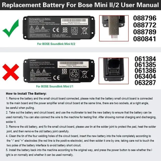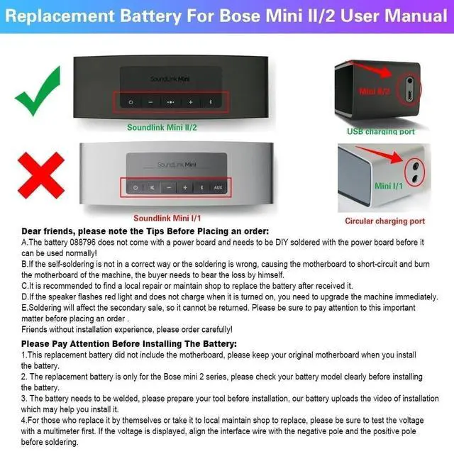 Bose Mini II/2 Grade: Not for Bose SoundLink Mini I/1 The battery does not come with a power board. You need to solder the power board to the battery yourself before you can use it normally. Comprehensive compatibility For BOSE Soundlink Mini II/2 speakers For Bose Soundlink Mini II/2 wireless speakers For the portable wireless speaker Bose Mini II/2 ATTENTION This model is only suitable for BOSE SoundLink Mini II/2 Not FOR soundLink Mini I/1 Note The battery is delivered without a protective plate. Dear customers, you have to weld yourself. Please pay attention to the following points when welding: A, right angle type, be careful when pulling out; B. Take out the battery and battery board and test the new battery with a multimeter to ensure that it can be used normally. C, move the pelvic joint downwards; D, adjust it and then add tin and solder point by point. Be careful not to touch the two poles of the battery interface to avoid short circuiting the battery; E, damage caused by contact; F. Reinstall the battery into the machine along the original route. After installation, press the power button to see whether the light lights normally.