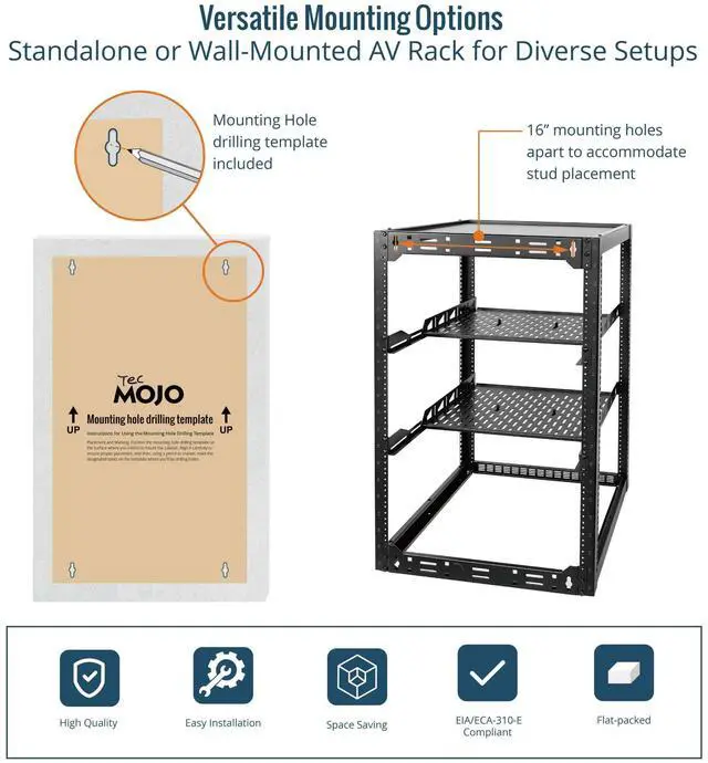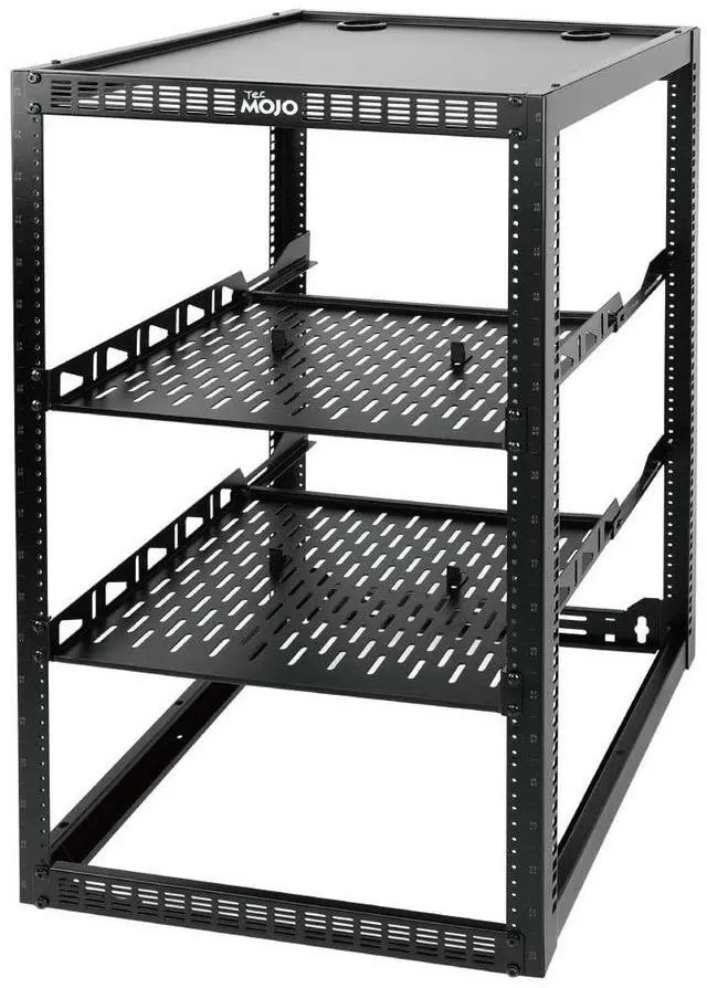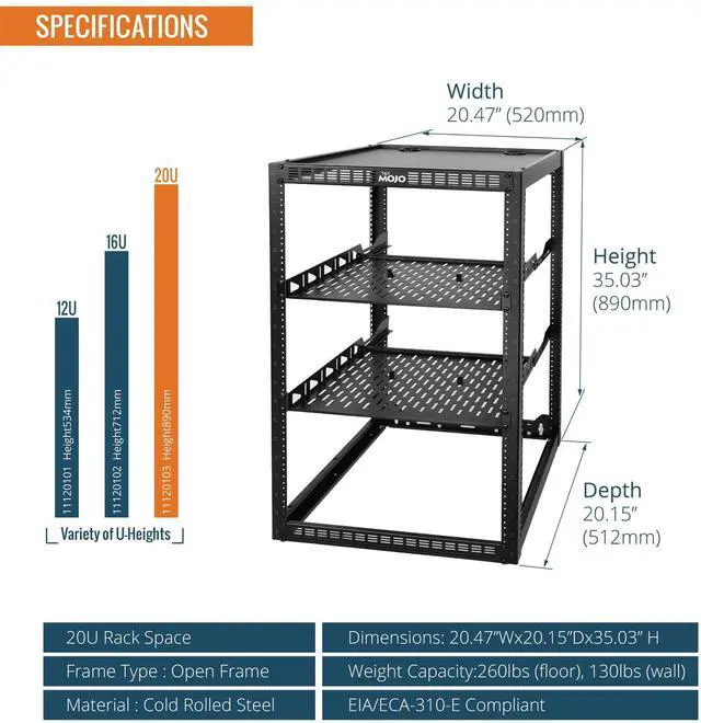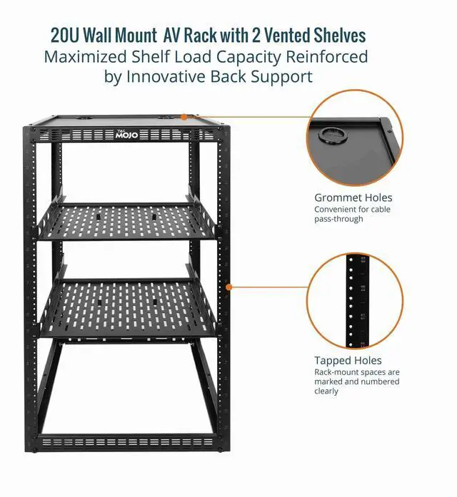 Powerful load-bearing Constructed from durable Cold Rolled Steel, Rack Shelf Back Support enhances stability, wall-mounted capacity of 130lbs, the ground-mounted up to 260lbs ^^ Considerate DesignsOpen-frame layout, including a top panel adding space, Anti-Slip Shelf Stops fixing devices and compatible racks for stack and expansion to meet requirements of home server rack ^^ Complete Accessories A 20U open frame server rack, two ventilated shelves, four shelf stops, four velcro straps and a set of equipment mounting screws ^^ Versatile Application Ideal for space-efficient multi-device setups in warehouses, retail, classrooms, offices and more; Excellent choices as AV Rack/IT Rack ^^ Effortless Setup Network Rack includes hardware, a comprehensive manual, mounting hole drilling template and an online assembly video to simplify setup